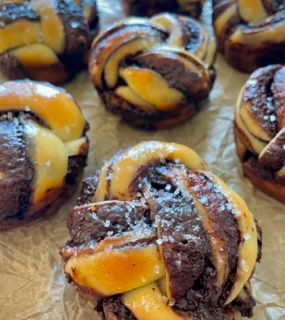 Nutella spread onto brioche dough then braided into a soft, buttery babka bun. Drizzled with a light glaze and sprinkled with course sugar.